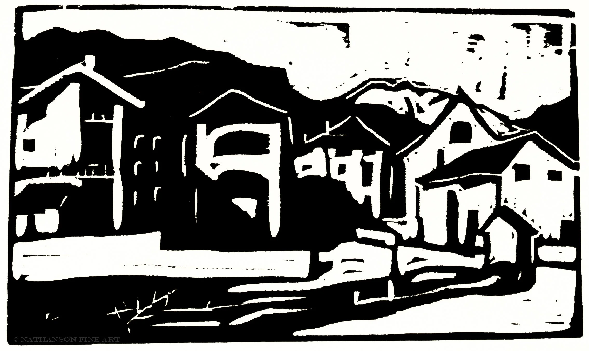 30. Winding Street – Tessin - the limited edition of 80 prints published in 1972 by Richard Nathanson (1947 - 2018), aka: Nr. 30 Dorfstrasse Tessin (Herzogenrath und Liska, 1987, p. 376), aka: 30 Street in Losone (Nathanson, 1977). Printed by Will Carter OBE (1912 - 2001) using Woodcut 30 - by Arthur Segal (1875 - 1944) carved in Ascona Switzerland c. 1914 - 1916. Ink on bespoke wove paper with deckle edges made by J. Barcham Green Ltd using the watermark: “a. Segal” on each 28.5 x 39.2 cm sheet. The publisher’s circular dry-stamp is on each numbered print.